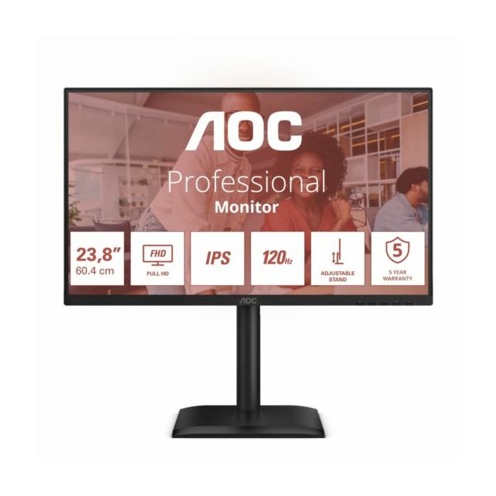 AOC 24E4U - Pro line 24" Full HD IPS 1920x1080@120 Hz 16:9 Contrast 1500:1 DCR 20m:1 4ms 300cd m2 178 178 VGA HDMI 1.4 DP 1.2 Speakers Audio output VESA 100x100 Black Flickerfree Low blue light PIVOT Height adjustment USB 3.2 hub