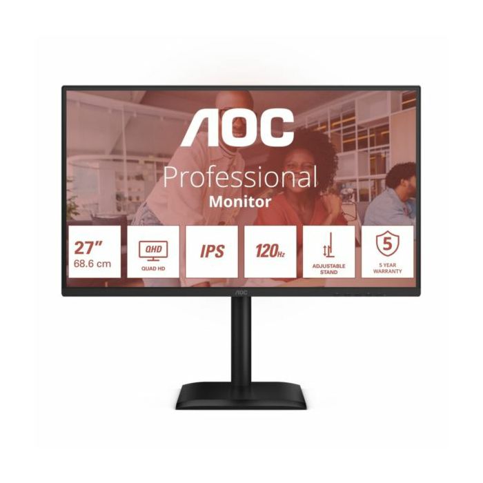 AOC Q27E4U - Pro line 27" QHD IPS 2560x1440@120 Hz 16:9 Contrast 1500:1 DCR 20m:1 4ms 350cd m2 178 178 VGA HDMI 1.4 DP 1.2 Speakers Audio output VESA 100x100 Black Flickerfree Low blue light PIVOT Height adjustment USB 3.2 hub