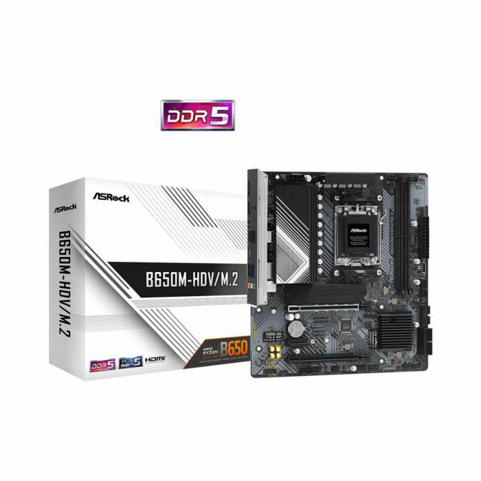 Asrock AMD AM5 B650M-HDV M.2 - Supports AMD Socket AM5 Ryzen 9000, 8000 and 7000 Series Processors 8 2 1 Power Phase, Dr.MOS Supports DDR5 6400 MHz (OC) 2 PCIe 4.0 x16, 1 PCIe 4.0 x1, 1 M.2 Key E for WiFi Integrated AMD RDNA 2 Graphics* Graphics Output Options: HDMI, DisplayPort Realtek ALC897 7.1 CH HD Audio Codec, Nahimic Audio 4 SATA3, 1 Blazing M.2 (PCIe Gen5x4), 1 Hyper M.2 (PCIe Gen4x4) 1 USB 3.2 Gen2 Front Type-C, 7 USB 3.2 Gen1 (2 Rear, 1 Rear Type-C, 4 Front) Dragon 2.5G LAN Supports ASRock Auto Driver Installer, BIOS Flashback Pre-Installed I O Shield