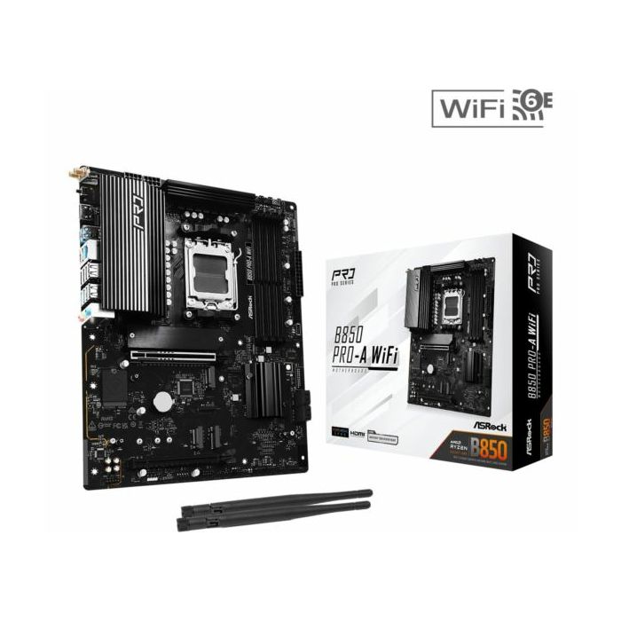 Asrock AMD AM5 B850 PRO-A WIFI - Supports AMD Socket AM5 Ryzen 9000, 8000 and 7000 Series Processors 14 2 1 Phase Power Design, 80A Dr.MOS for VCore SOC MISC 4 x DDR5 DIMMs Supports Dual Channel, up to 8000 (OC) 1 PCIe 5.0 x16, 1 PCIe 4.0 x16 Graphics Output Options: 1 HDMI, 1 USB Type-C (DP-alt) Realtek ALC897 7.1 CH HD Audio Codec 1 Blazing M.2 (PCIe Gen5x4), 2 Hyper M.2 (PCIe Gen4x4), 1 Ultra M.2 (PCIe Gen3x4), 4 SATA3 1 USB 3.2 Gen2x2 Type-C (Front), 1 USB 3.2 Gen2 Type-C (Rear), 1 USB 3.2 Gen1 Type-C (Rear), 6 USB 3.2 Gen1 (4 Rear, 2 Front), 9 USB 2.0 (6 Rear, 3 Front) Realtek 2.5G LAN 802.11axe WiFi 6E Bluetooth Supports BIOS Flashback