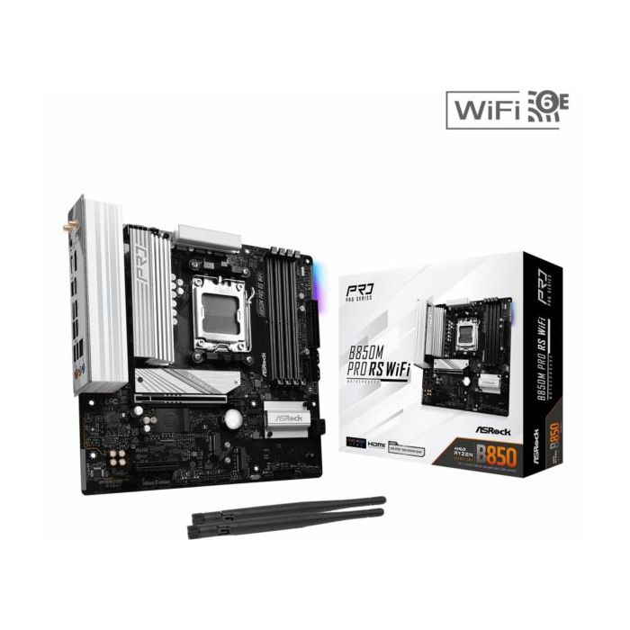 RMA Asrock AMD AM5 B850M PRO RS WIFI - Supports AMD Socket AM5 Ryzen 9000, 8000 and 7000 Series Processors 8 2 1 Phase Power Design, Dr.MOS for VCore SOC MISC 4 x DDR5 DIMMs, Supports Dual Channel, up to 8000 (OC) 1 PCIe 5.0 x16, 1 PCIe 4.0 x4 Graphics Output Options: 1 HDMI, 1 DisplayPort Realtek ALC897 7.1 CH HD Audio Codec, Nahimic Audio 1 Blazing M.2 (PCIe Gen5x4), 2 Hyper M.2 (PCIe Gen4x4), 4 SATA3 1 USB 3.2 Gen2 Type-C (Rear), 1 USB 3.2 Gen2 Type-A (Rear), 1 USB 3.2 Gen1 Type-C (Front), 6 USB 3.2 Gen1 (2 Rear, 4 Front), 8 USB 2.0 (4 Rear, 4 Front) Realtek 2.5G LAN 802.11axe WiFi 6E Bluetooth Supports M.2 Bottom Heatsink, BIOS Flashback