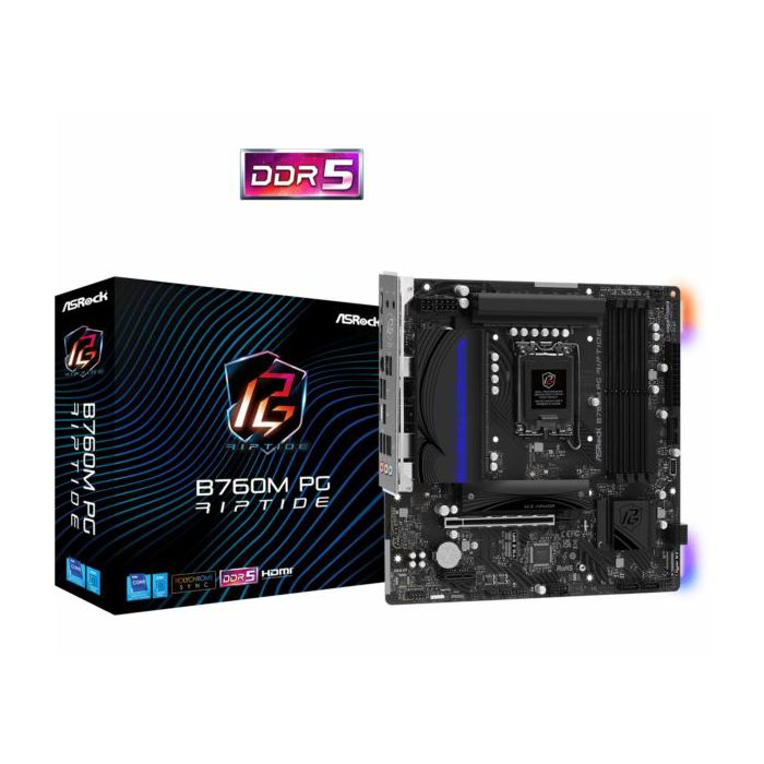 RMA Asrock Intel LGA1700 B760M PG RIPTIDE - Supports 14th, 13th Gen 12th Gen Intel Core Processors (LGA1700) 14 1 1 Power Phase Supports DDR5 7200MHz (OC) 1 PCIe 4.0 x16, 1 PCIe 4.0 x1, 1 M.2 Key E for WiFi Graphics Output Options: HDMI, DisplayPort Realtek ALC897 7.1 CH HD Audio Codec, Nahimic Audio 4 SATA3, 2 Hyper M.2 (PCIe Gen4x4) 2 USB 3.2 Gen1 Type-C (1 Rear, 1 Front), 5 USB 3.2 Gen1 Type-A (3 Rear, 2 Front), 6 USB 2.0 (4 Rear, 2 Front) Dragon 2.5G LAN Supports ASRock Auto Driver Installer