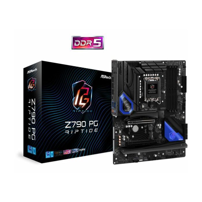 RMA Asrock Intel LGA1700 Z790 PG RIPTIDE - Supports 14th, 13th Gen 12th Gen Intel Core Processors 14 1 1 Phase Power Design, Dr.MOS for VCore GT 4 x DDR5 DIMMs, supports up to 6800 (OC) 1 PCIe 5.0 x16, 1 PCIe 4.0 x16, 1 PCIe 3.0 x1, 1 M.2 Key-E for WiFi Graphics Output Options: 1 HDMI, 1 DisplayPort 7.1 CH HD Audio (Realtek ALC897 Audio Codec), Nahimic Audio 1 Blazing M.2 (PCIe Gen5x4), 4 Hyper M.2 (PCIe Gen4x4), 8 SATA3 1 USB 3.2 Gen2x2 Type-C (Front), 2 USB 3.2 Gen2 Type-A (Rear), 1 USB 3.2 Gen1 Type-C (Rear), 6 USB 3.2 Gen1 Type-A (4 Rear, 2 Front), 6 USB 2.0 (2 Rear, 4 Front) Killer 2.5G LAN REPACKED