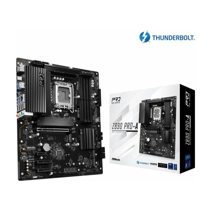 Asrock Intel LGA1851 Z890 PRO-A - Supports Intel Core Ultra Processors (Series 2)(LGA1851) 16 1 1 1 1 Power Phase, Dr.MOS for VCore GT 4 x DDR5 DIMMs Supports Dual Channel, up to 9066 (OC) 1 PCIe 5.0 x16, 2 PCIe 4.0 x4, 1 PCIe 4.0 x1, 1 M.2 Key E for WiFi Graphics Output Options: 1 HDMI, 1 DisplayPort, 1 Thunderbolt 4 Type-C Realtek ALC897 7.1 CH HD Audio Codec 4 SATA3 1 Blazing M.2 (PCIe Gen5 x4), 2 Hyper M.2 (PCIe Gen4 x4), 1 Hyper M.2 (PCIe Gen4 x4 SATA3) 1 Thunderbolt 4 Type-C (Rear) 2 USB 3.2 Gen2x2 Type-C (1 Rear, 1 Front), 1 USB 3.2 Gen2 Type-A (Rear), 6 USB 3.2 Gen1 (2 Rear, 4 Front), 8 USB 2.0 (4 Rear, 4 Front) Realtek 2.5G LAN Supports BIOS Flashback, Memory OC Shield, Durable Caps with 1000uF Capacitance
