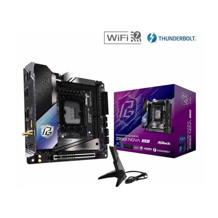 Asrock Intel LGA1851 Z890I NOVA WIFI - Supports Intel Core Ultra Processors (Series 2) (LGA1851) 12 1 1 1 1 Power Phase, 110A SPS for VCore 2 x DDR5 DIMMs Supports Dual Channel, up to 9866 (OC) 1 PCIe 5.0 x16 Graphics Output Options: 1 HDMI, 2 Thunderbolt 4 Type-C Realtek ALC4082 7.1 CH HD Audio Codec, Nahimic Audio 2 SATA3 1 Blazing M.2 (PCIe Gen5 x4), 1 Hyper M.2 (PCIe Gen4 x4), 1 Hyper M.2 (PCIe Gen4 x4 SATA3) 2 Thunderbolt 4 Type-C (Rear), 1 USB 3.2 Gen2x2 Type-C (Front), 6 USB 3.2 Gen2 Type-A (Rear), 2 USB 3.2 Gen1 (Front), 2 USB 2.0 (Front) 5Gbps LAN 802.11be Wi-Fi 7 Bluetooth Supports BIOS Flashback, Memory OC Shield, 20K Caps with 1000uF Capacitance