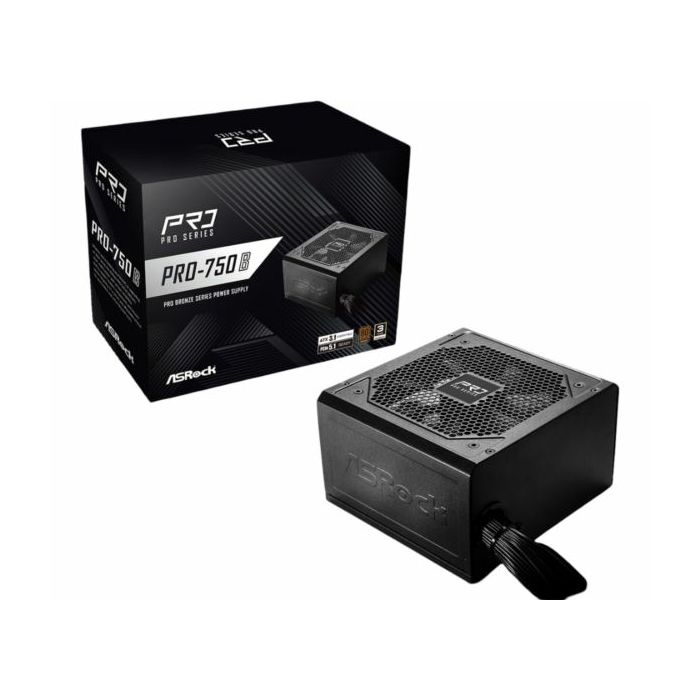 ASRock PSU PRO Series PRO-750B, 750W, 80 Bronze - 80 PLUS BRONZE Certified ATX3.1 PCIe5.1 Ready Native 12V-2x6 Connector Dual Color Design Low noise 120mm FAN Reliable 3-Year Warranty Dimensions(L x W x H) - 140mm x 150mm x 86mm Cable Type: Flat Motherboard cable (24pin): 1x, EPS 12V CPU connectors (4 4pin): 1x, PCIe5.1 connectors(12 4pin) Dual Color: 1x (450W), PCIe connectors (6 2pin): 1x, 4-pin Peripheral connectors: 2x, SATA 5-pin connectors: 4x