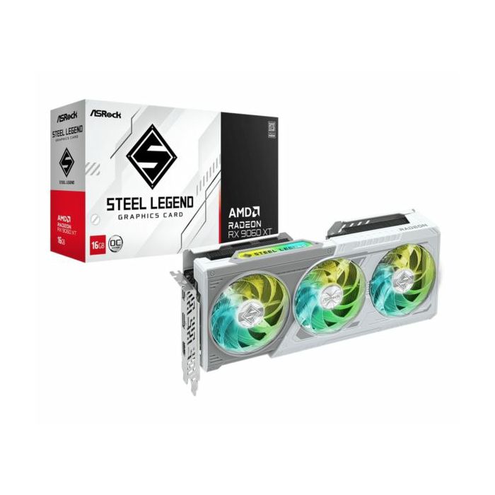 Asrock Radeon RX 9060 XT Steel Legend 16GB OC - Boost Clock: Up to 3320 MHz 20 Gbps Game Clock: 2780 MHz 20 Gbps 16GB GDDR6 on 128-Bit Memory Bus AMD RDNA 4 Architecture 32 Compute Units (3rd Gen RT 2nd Gen AI Accelerators) Microsoft DirectX 12 Ultimate PCI Express 5.0 Support 1 x 8-pin Power Connector 2 x DisplayPort 2.1a, 1 x HDMI 2.1b Recommended PSU: 550W