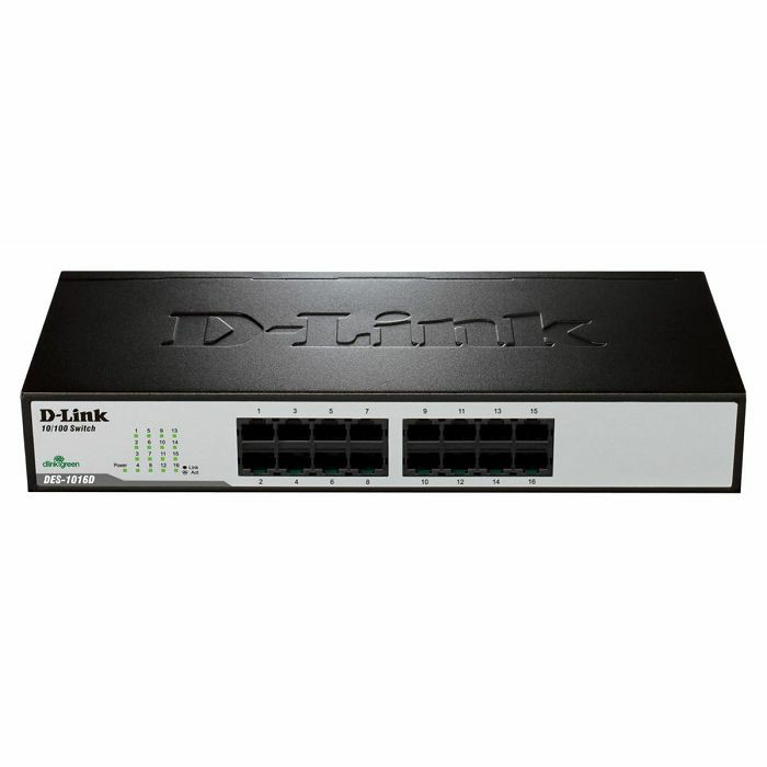 DES-1016D je SOHO neupravljivi preklopnik, metalnog kućišta , namjenjen manjim mrežama i radnim grupama. Šesna est 10/100 Fast Ethernet portova posjeduju svojstvo automatske detekcije UTP kabela, omogućavajući rad uz korištenje straight-through ili crossover kabela. Koristi interno napajanje, hladi se dvama bočno ugrađenim ventilatorima. Montaža može biti zidna ili stolna. Zbog desktop dimenzija koriste se duži metalni nosači pri ugradnji u 19" komunikacijski ormar.