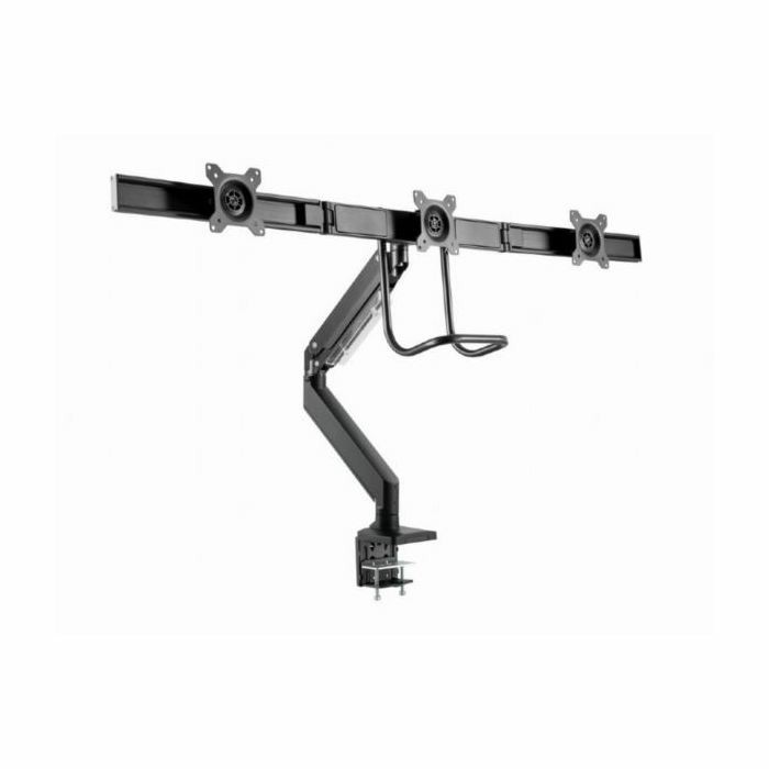 Gembird Desk mounted adjustable monitor arm for 3 monitors - Arm rotates, extends and retracts, tilts to change reading angles Works with almost any LCD monitor (max. 27") Durable adjustable gas-springs suitable for monitors of 1 - 6 kg VESA compatible (100 x 100 mm and 75 x 75 mm)