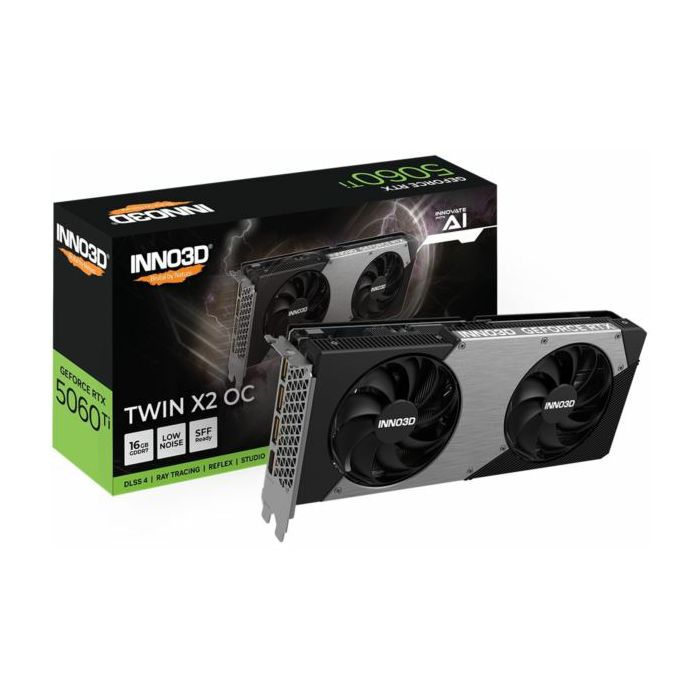 INNO3D GeForce RTX 5060 Ti TWIN X2 OC, 16GB GDDR7 (N506T2-16D7X-191073N) - CUDA Cores: 4608 Boost Clock (MHz): 2602 MHz Base Clock (MHz): 2235 MHz Minimum System Power Requirement (W): 650W Supplementary Power Connectors: 1x PCIe 8-pin cables Memory Clock: 28Gbps Standard Memory Config: 16GB GDDR7 Memory Interface Width: 128-bit Memory Bandwidth (GB sec): 448 GB sec PCI-E Gen 5 Standard Display Connectors: 1x HDMI 2.1b, 3x DisplayPort 2.1b Dimensions (LxHxW): 250x116x41mm