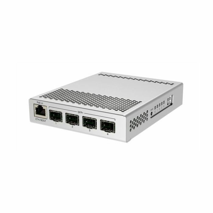 MikroTik CRS305-1G-4S IN, Cloud Core switch, featuring four SFP ports, for up to 10 Gbit per port. The device has a 1 Gbit copper ethernet port for management access and two DC jacks for power redundancy. The device is a very sleek and compact metallic case without any fans, for silent operation. Includes 24V 0.8A AC power adapter