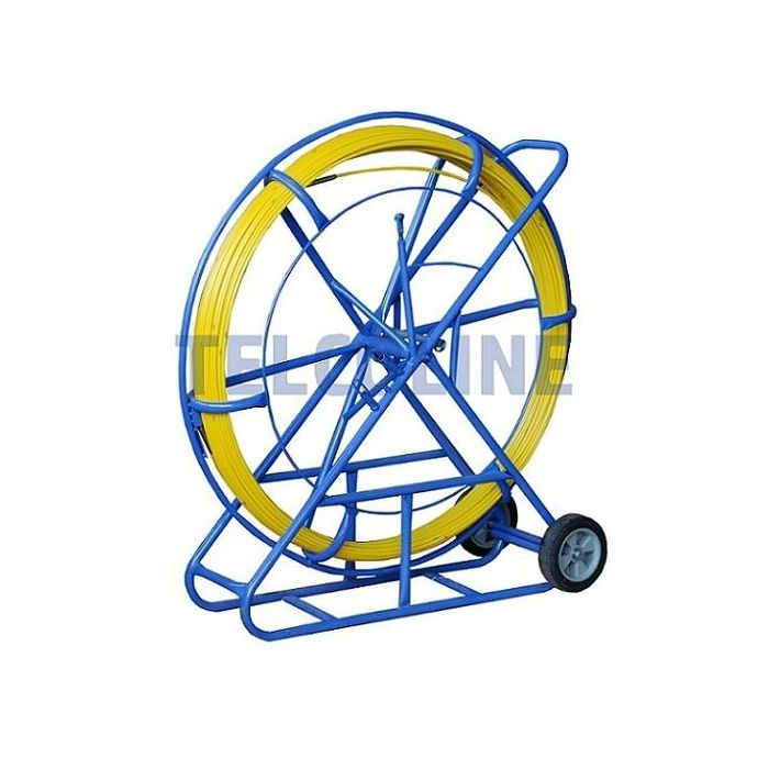 NFO Fiberglass (FRP) remote control for pulling cables, 8mm, 150m, yellow - placed on a special stand to facilitate its unwinding. Fiber with high elasticity and resistance to bending and tearing, covered with yellow PE plastic that has a protective function and ensures good sliding properties. Blue powder-coated fiber frame and a special "eye" for fiber guidance. The stands design ensures functional transport, storage and use. The end of the fiber ends with a guide head Application: - Pulling cables between telecommunication manholes; Pushing cables under roads; Installations in suspended ceilings; Cleaning and unblocking pipes, culverts, sewage systems; Inserting cables into protective pipes Technical data: Dimensions: 115x45x125 cm Outer diameter (with cover): 8 mm Length: 150 m Weight (with frame): approx. 25 kg