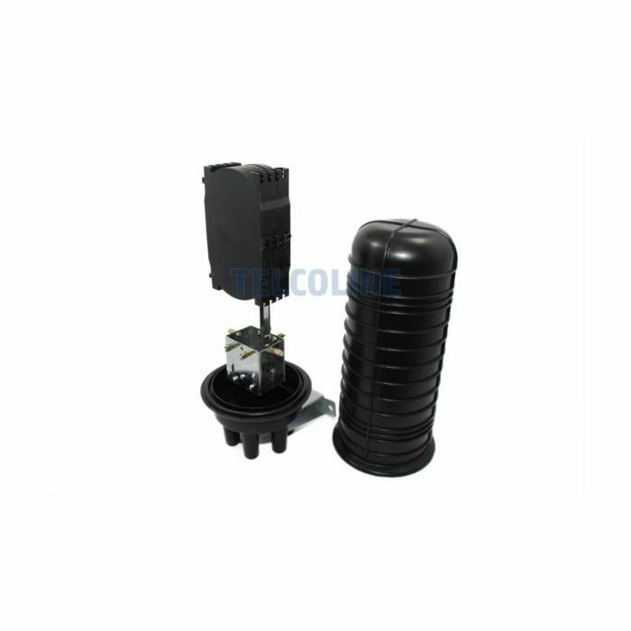 NFO Splice Closure 96F, 4 round entries, 1 oval, 4 trays, Height 450 mm, Pole and Wall mount Material: Polypropylene PP Color: Black Cover diameter: 160 mm Weight: 4 kg Protection: IP68 4 splice trays Max. 96 fiber optic splice sleeves Operating temperature: -35 C 65 C Application: Aerial, duct, ground installations Equipment: Wall mounting bracket, Clamp for pole mounting, Fiber optic splice sleeve (x96), Heat shrink sleeve (x5), Insulation tape, Fiber clip