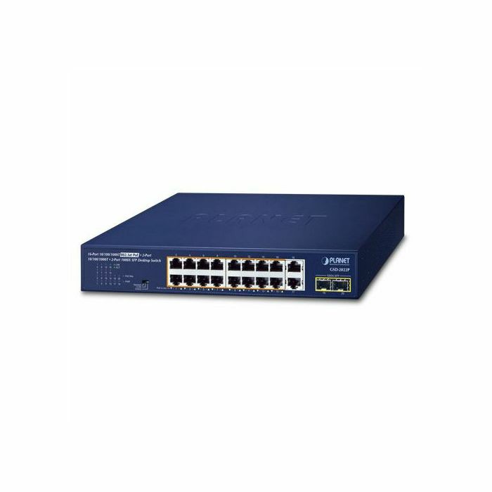 Planet 16-Port 10 100 1000T 802.3at PoE 2-Port 10 100 1000T 2-Port 1000X SFP Desktop Switch. Supports PoE power up to 32 watts for each PoE port, with a total PoE budget of 185W. Remote power feeding up to 100m in standard mode with 250m in extend mode. 12-inch desktop size. Rackmonunt ears included.