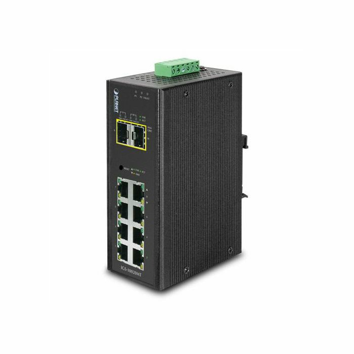 Planet IGS-10020MT, Layer 2 Industrial 10 -port Full Gigabit Managed Switch. IP30 aluminum Industrial case. 8* 10 100 1000 gigabit copper RJ45 ports 2* 100 1000X GBIC SFP slots. Supports redundant ring technology. DIN-rail and wall mount design. Redundant Power Design 12 to 48V DC, redundant power with polarity reverse protect function. AC 24V power adapter acceptable. (-40 to 75 degree C operating temperature). With the supported Modbus TCP IP protocol, the IGS10020MT can easily integrate with SCADA systems, HMI systems and other data acquisition systems in factory floors. Max Power consumption 10W