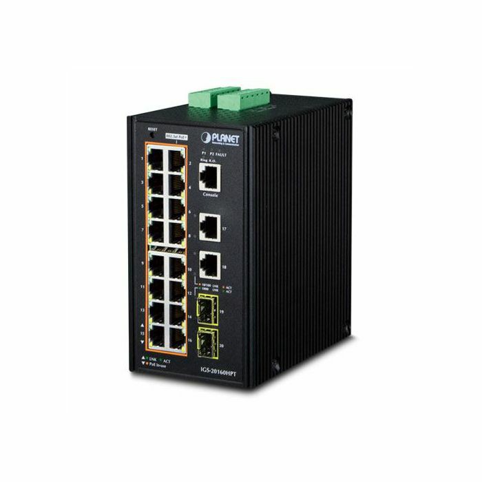 Planet IGS-20160HPT, Industrial 16-Port 10 100 1000T 802.3at PoE 2-Port 10 100 1000T 2-Port 100 1000X SFP Managed Switch (-40 75 Degrees C). IP30 Industrial L2 L4 16-Port 1000T 802.3at PoE 2-Port 1000T 2-port 100 1000X SFP Full Managed Switch (-40 to 75 C, dual redundant power input on 48 56VDC terminal block, DIDO, ERPS Ring Supported)