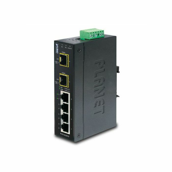 Planet IGS-620TF, Industrial 4-Port 10 100 1000T 2-Port 100 1000X SFP Ethernet Switch, 2-port SFP slot interface, SFP supports 1000Base-X and 100Base-FX transceiver via DIP switch configured, Slim IP30 metal case protection, DIN Rail and Wall Mount Design, Redundant Power Design, -40 to 75 degrees C operating temperature