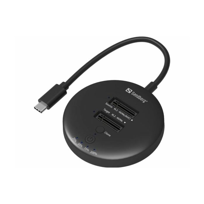 Sandberg USB 3.2 Cloner Dock for NVMe M.2 SSD - makes it easy to read, write, and clone your NVMe SSDs. Cloning from one disk to another can be done entirely without connecting to a PC. The dock also works perfectly as a disk expansion, allowing you to have two extra SSDs connected to your computer simultaneously. Ideal for backup, data transfer, and storage expansion. Supports up to 20 Gbps via USB-C and requires no tools or software installation. Supports offline 1:1 clone (no PC required) Dual-bay M.2 NVMe SSD support USB3.2 Gen2 SuperSpeed up to 10 Gbps (backward compatible) Transfer speed max: USB3.2 Gen2x1 *2 SSD: Up to 10 Gbps; USB3.2 Gen2x2 *1 SSD: Up to 20 Gbps SSD types supported: NVMe, M.2, M Key SSD sizes supported: 2230 2242 2260 2280 22110 LED indicators for power and activity Max. capacity supported: 8 TB NOTE: SATA M.2 SSD not supported