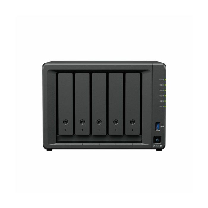 Synology DS1525 5-Bay CPU Model: AMD Ryzen V1500B CPU Cores: 4 CPU Frequency: 2.2 GHz System Memory: 8 GB DDR4 ECC SODIMM Total Memory Slots: 2 Maximum Memory Capacity: 32 GB (16 GB x 2) M.2 Drive Slots: 2x NVMe Drive Supported: 3.5" SATA HDD, 2.5" SATA SSD, M.2 2280 NVMe SSD RJ-45 2.5GbE LAN Port x2 USB 3.2 Gen 1 Port x1 PCIe Expansion: 1x Gen3x2 network upgrade slot Size (Height x Width x Depth): 166 mm x 230 mm x 223 mm Packaging Content: Main Unit X 1, Accessory Pack X 1, AC Power Adapter X 1. AC Power Cord X 1, RJ-45 LAN Cable X 2