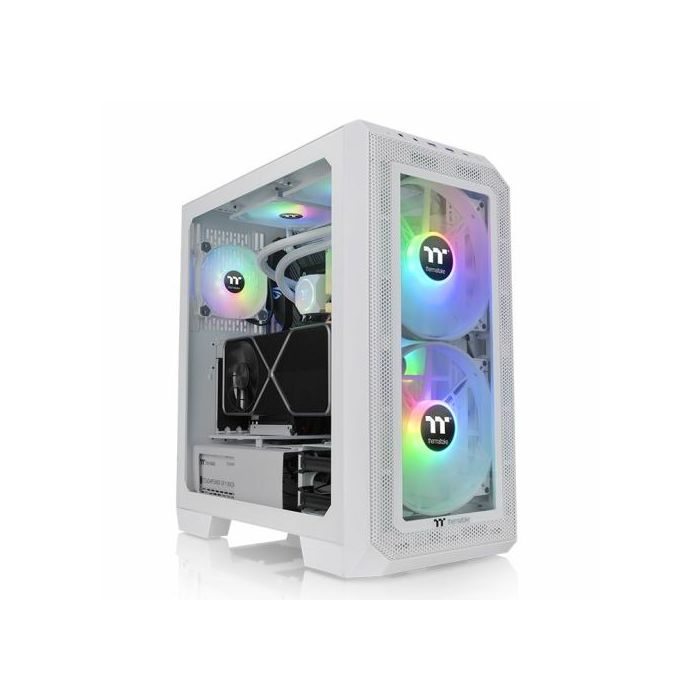 Thermaltake View 300 MX Snow Mid Tower Chassis View Mid Tower Dimension (H x W x D): 505 x 230 x 506 mm 4mm Tempered Glass x 1 SPCC ABS Front(intake): 200 x 200 x 30 mm x 2, Rear(exhaust): 120 x 120 x 25 mm x 1 2 x 3.5 , 4 x 2.5 or 6 x 2.5 6.7 x 6.7 (Mini ITX), 9.6 x 9.6 (Micro ATX), 12 x 9.6 (ATX), 12 x 13 (E-ATX) USB 3.2 (Gen 2) Type-C x 1, USB 3.0 x 2, HD Audio x 1 CPU cooler height limitation: 175mm, VGA length limitation: 280mm(With reservoir), 400mm(Without reservoir), PSU length limitation: 200mm