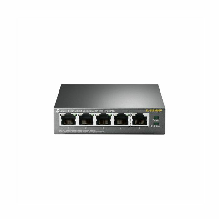 TP-Link TL-SG1005P, (5)1000Mbps Gigabit RJ45 Ports Unmanaged Desktop PoE Switch, with 4 x PoE ports, 8023af compliant up to 15,4W per port. PoE budget up to 56W. Fanless design with external power adapter.