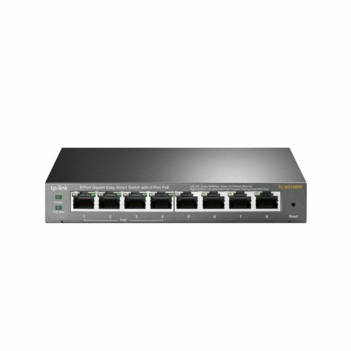 TP-Link TL-SG108PE 8-Portni Gigabit Stolni PoE Smart Switch. 8 x 10 100 1000 RJ45 porta od kojih 4 podržavaju PoE (802.3af), 55W PoE budžet, MTU Port Tag-based VLAN, QoS, IGMP Snooping, Čelično kućište, Pasivno hlađenje. Dolazi sa vanjskim strujnim adapterom.