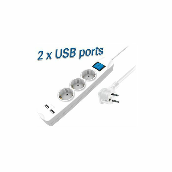 Transmedia 3-way power strip with two USB charging ports, 1,5m white