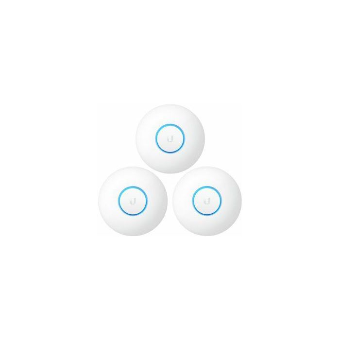 Ubiquiti Networks UAP-nanoHD-3, 3-Pack of 4x4 MU-MIMO 802.11ac Wave 2 Access Point. Supports 200 Concurrent Users. 802.3af PoE Compatibility. 2,4Ghz speed up to 300 Mbps, 1733 Mbps @ 5Ghz. Dimension 160 x 160 x 32,65 mm. PoE adapter not included. Can be powered by any 802.3af PoE. Max power 10,5W. TX power 2,4ghz 23dbm, 5ghz 26dbm. Wall Ceiling mount kits included.