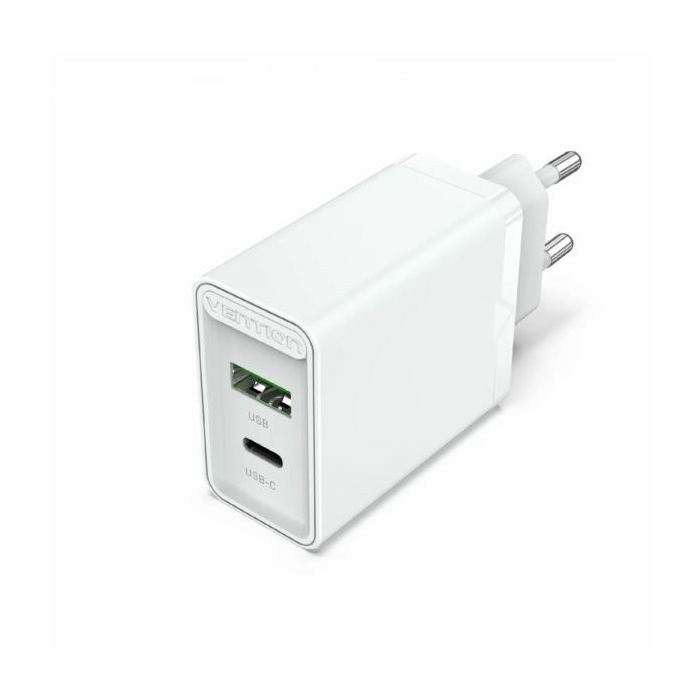 Vention 2-Port USB (A C) Wall Charger (18W 20W) EU-Plug, White - Protocol: USB-C: PD3.0 QC4.0 FCP AFC BC1.2 Apple 2.4A Output: USB-C: 5V==3A 9V==2.22A 12V==1.67A (20W max) USB: 5V==3A; 9V==2A; 12V==1.5A (18W max) Dual output: 5V 3.4A (USB USB-C simultaneously) PD 20W