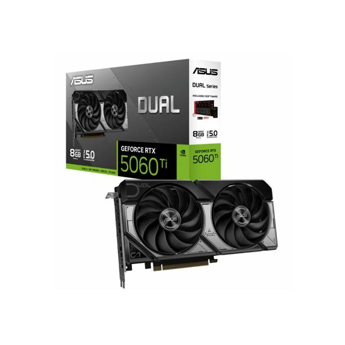 DUAL-RTX5060TI-O16G, NVIDIA GeForce, RTX5060, PCIe 5.0 x16, 16384, GDDR7, 128-bit, 2.602 MHz, Takt memorije 28.000 MHz, 3x Display port 2.1b, 1x HDMI 2.1b, 7680x4320